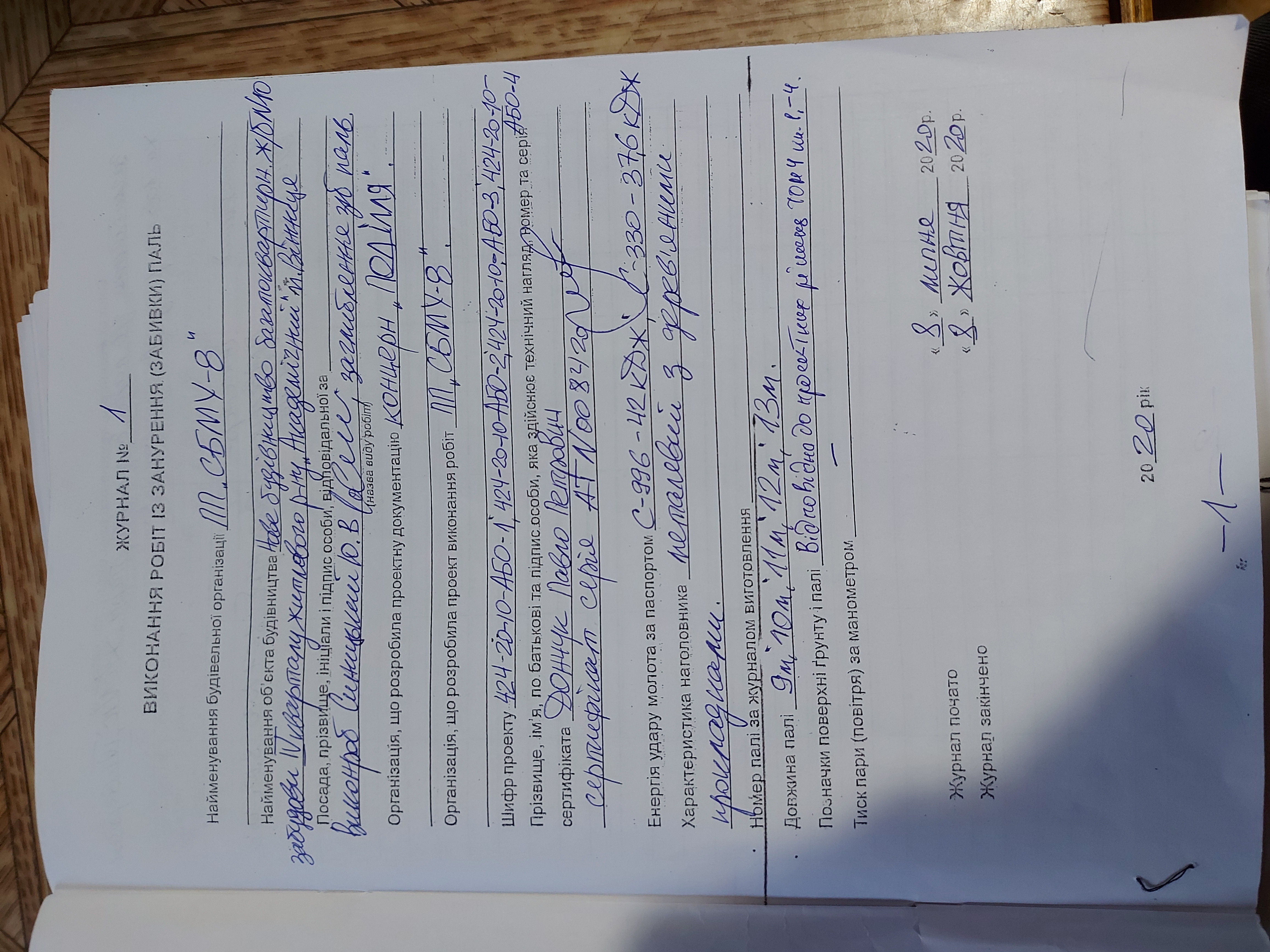| 12 | Журнал виконання робіт із занурення (забивки) паль | Відповідає |