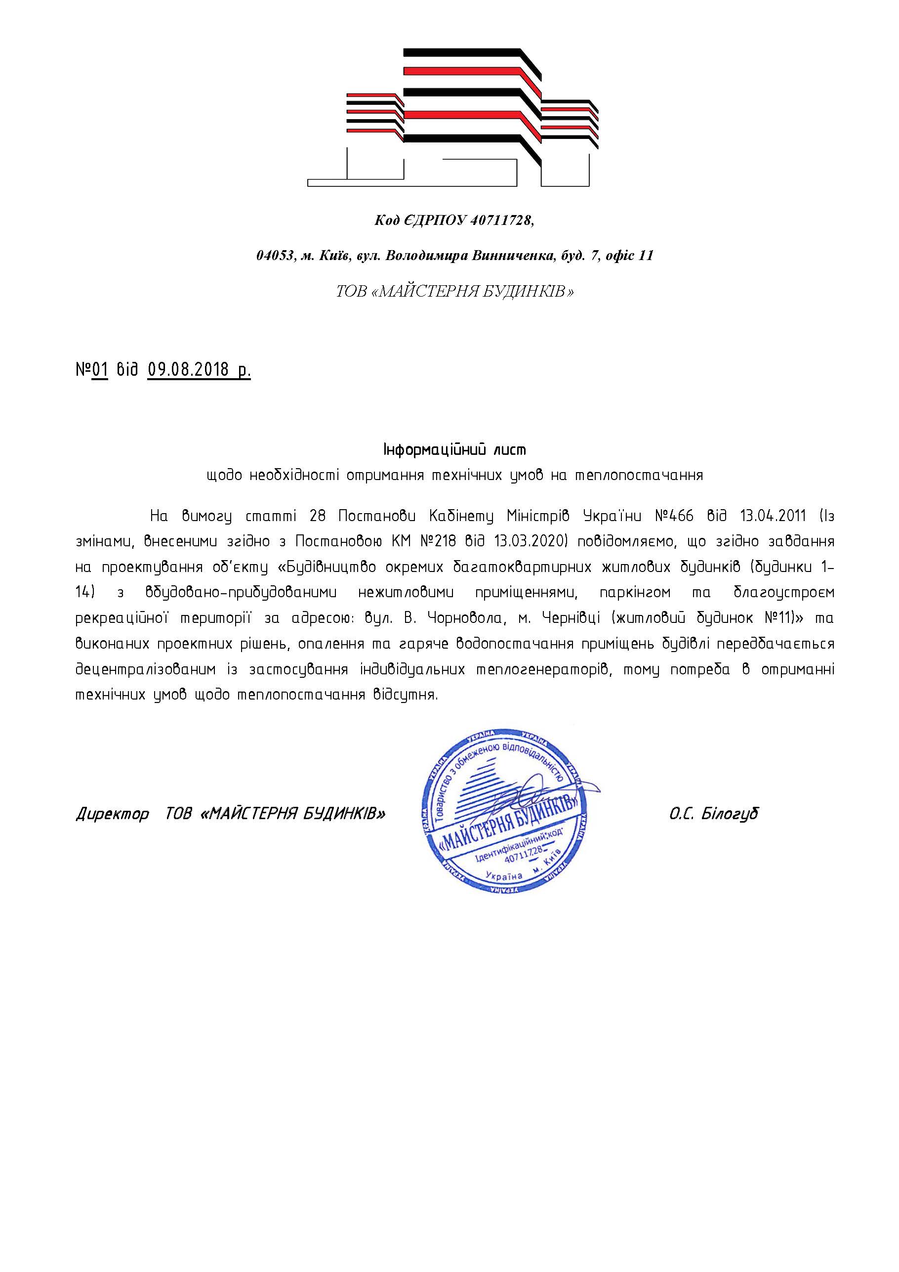 "Будівництво окремих багатоквартирних житлових будинків (будинки 1-14) з вбудовано-прибудованими нежитловими приміщеннями, паркінгом та благоустроєм рекреаційної території за адресою: вул. В. Чорновола, м. Чернівці (будинок 11)".