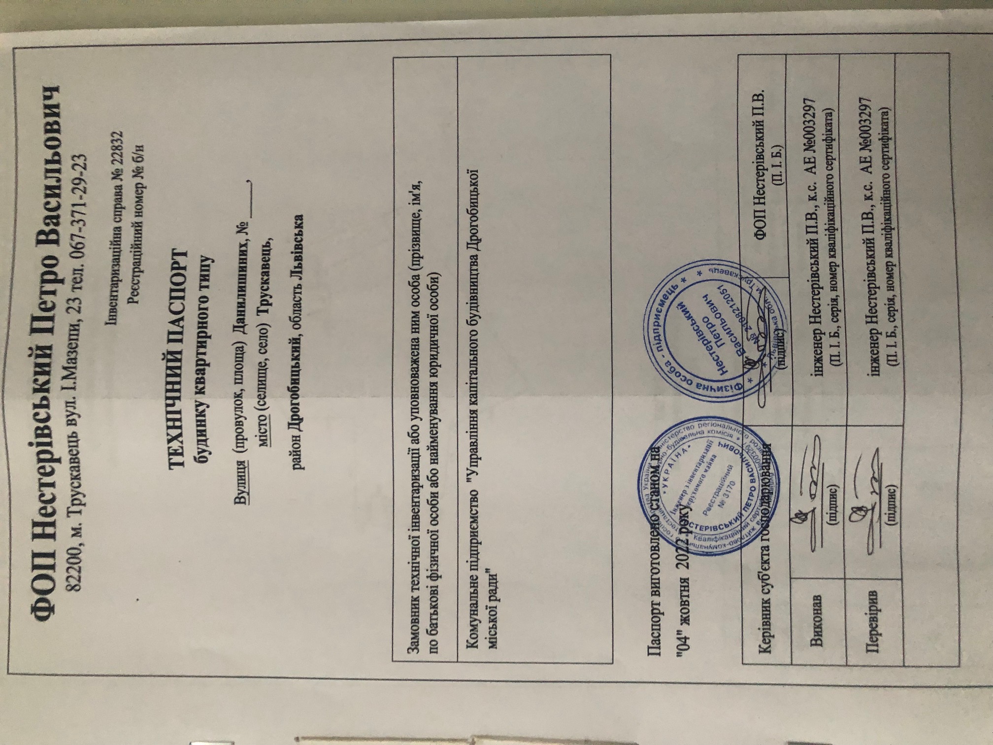 | Посада | ПІб, Сертифікат | Найменування документа про призначення | Номер документа про призначення | Дата документа про призначення | Інженер сертифікований | НЕСТЕРІВСЬКИЙ ПЕТРО ВАСИЛЬОВИЧ (АТ 009984, АТ 003833, ІТ 002215, АЕ 003297) |