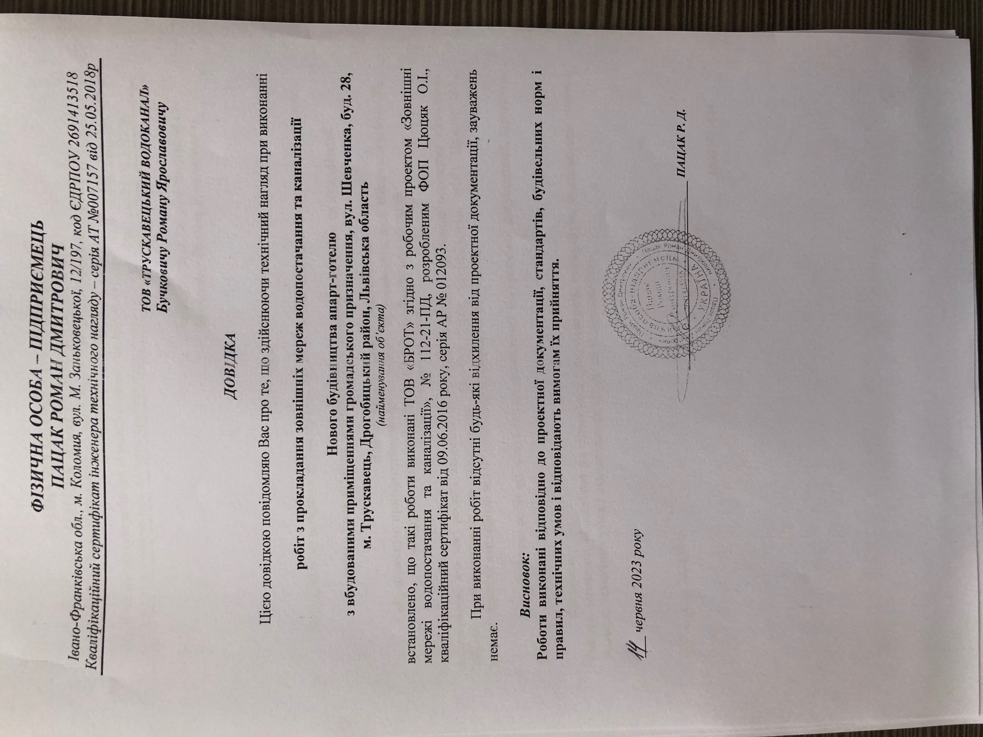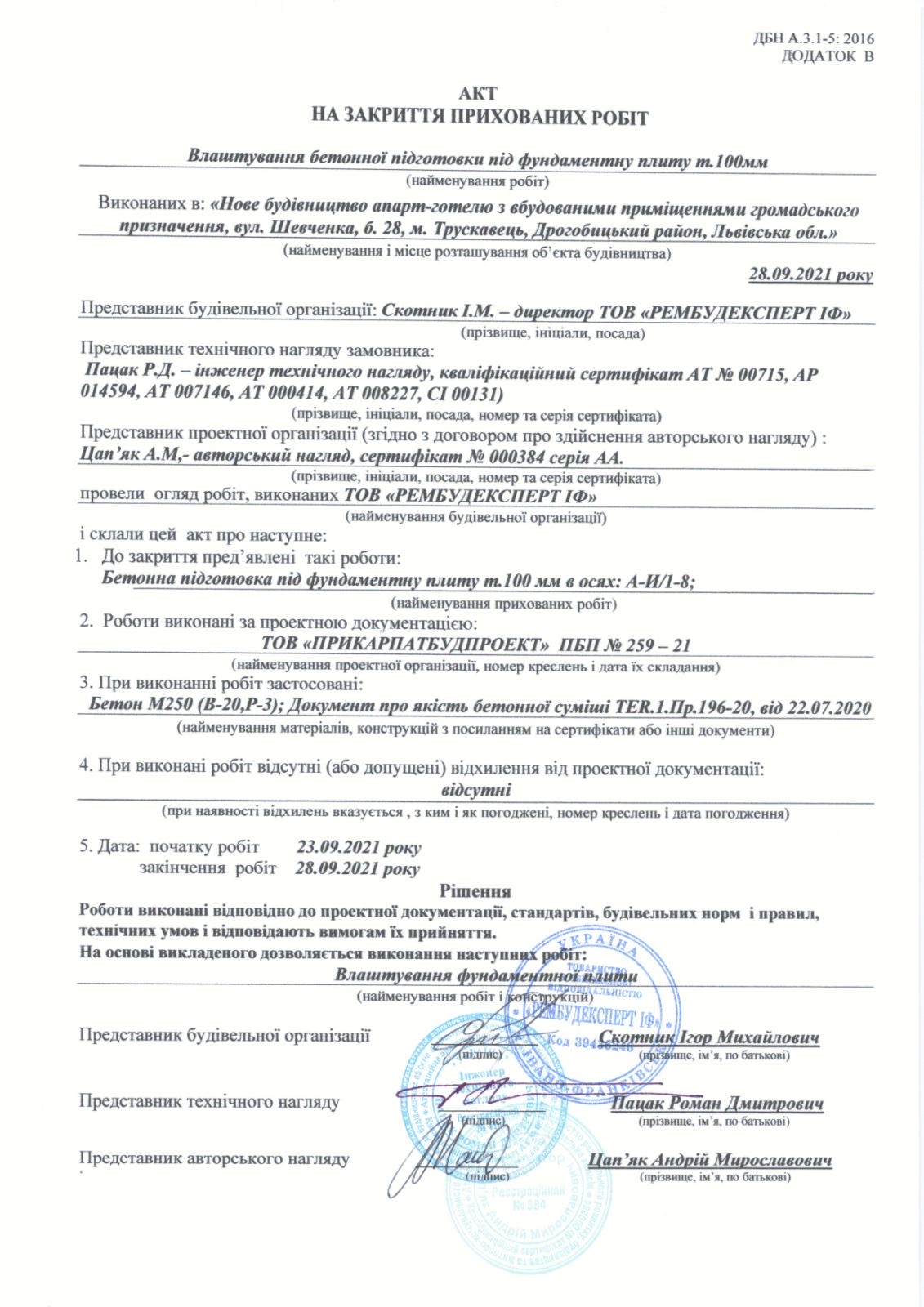 | EX01:0168-2491-3146-8578 | Діючий | ТОВ "Українська будівельно-технічна експертиза" (39190177) Версія №1 Статус (поточна) | Назарук Роман Мирославович (СІ- 01197, АЕ 004399, АЕ 004644, АЕ 004996, АТ 007097, АЕ 000328, АЕ 000811, АЕ 007204, АТ 008062, СІ- 00398 ) | щодо розгляду проектної документації на будівництво | 7-023-21ЕП/ІФ (від 30.08.2021) | Позитивний |