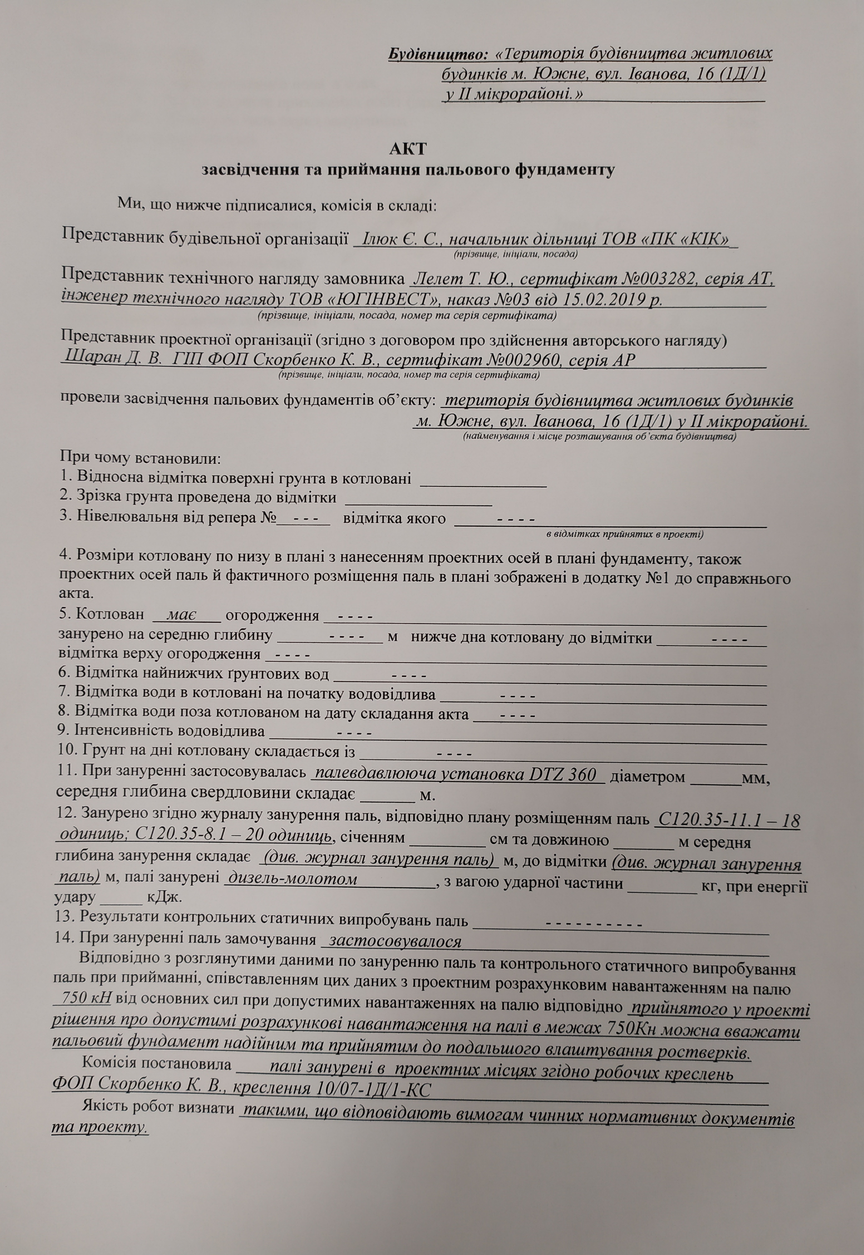 | 12 | Журнал виконання робіт із занурення (забивки) паль | Відповідає |