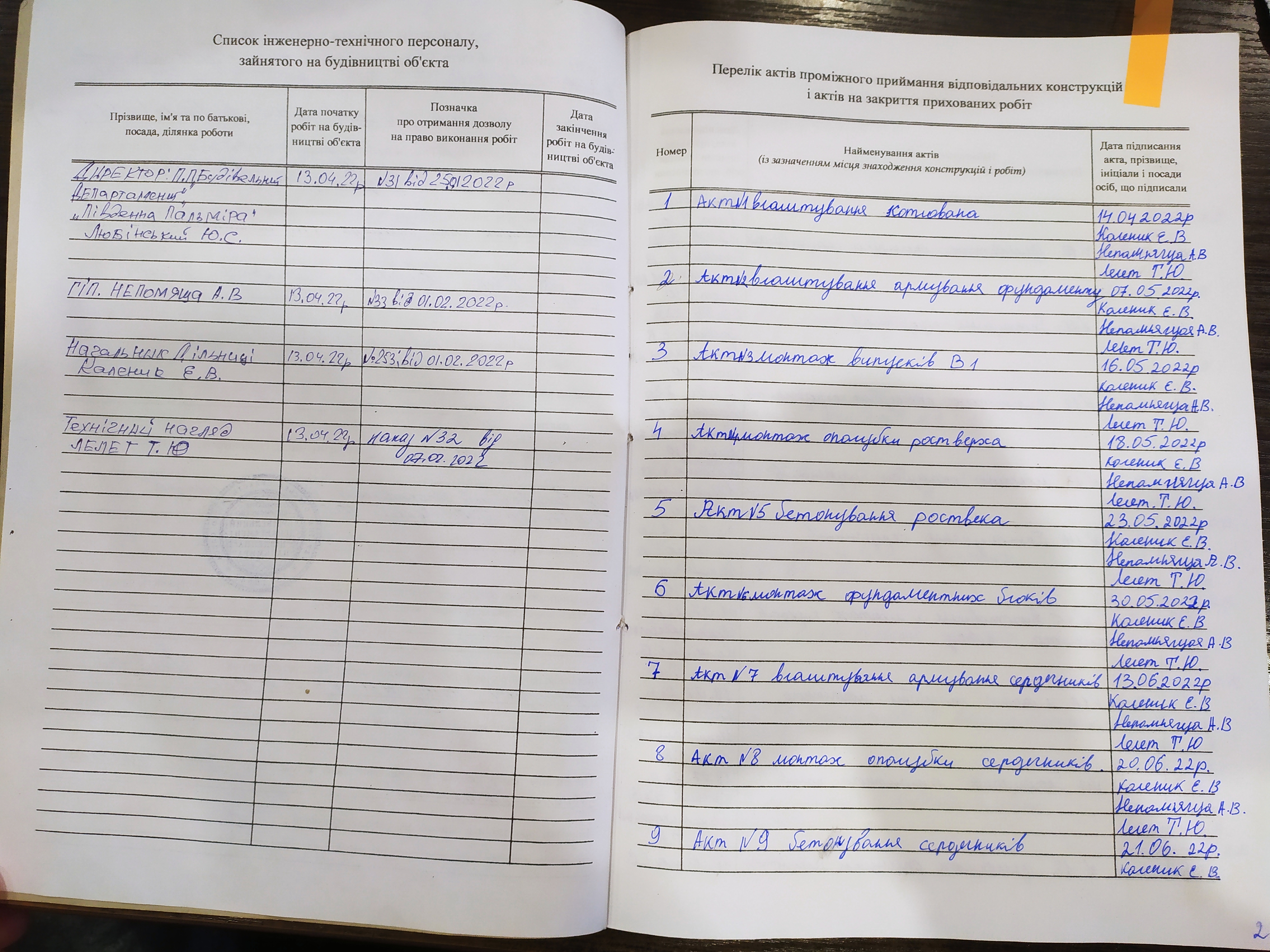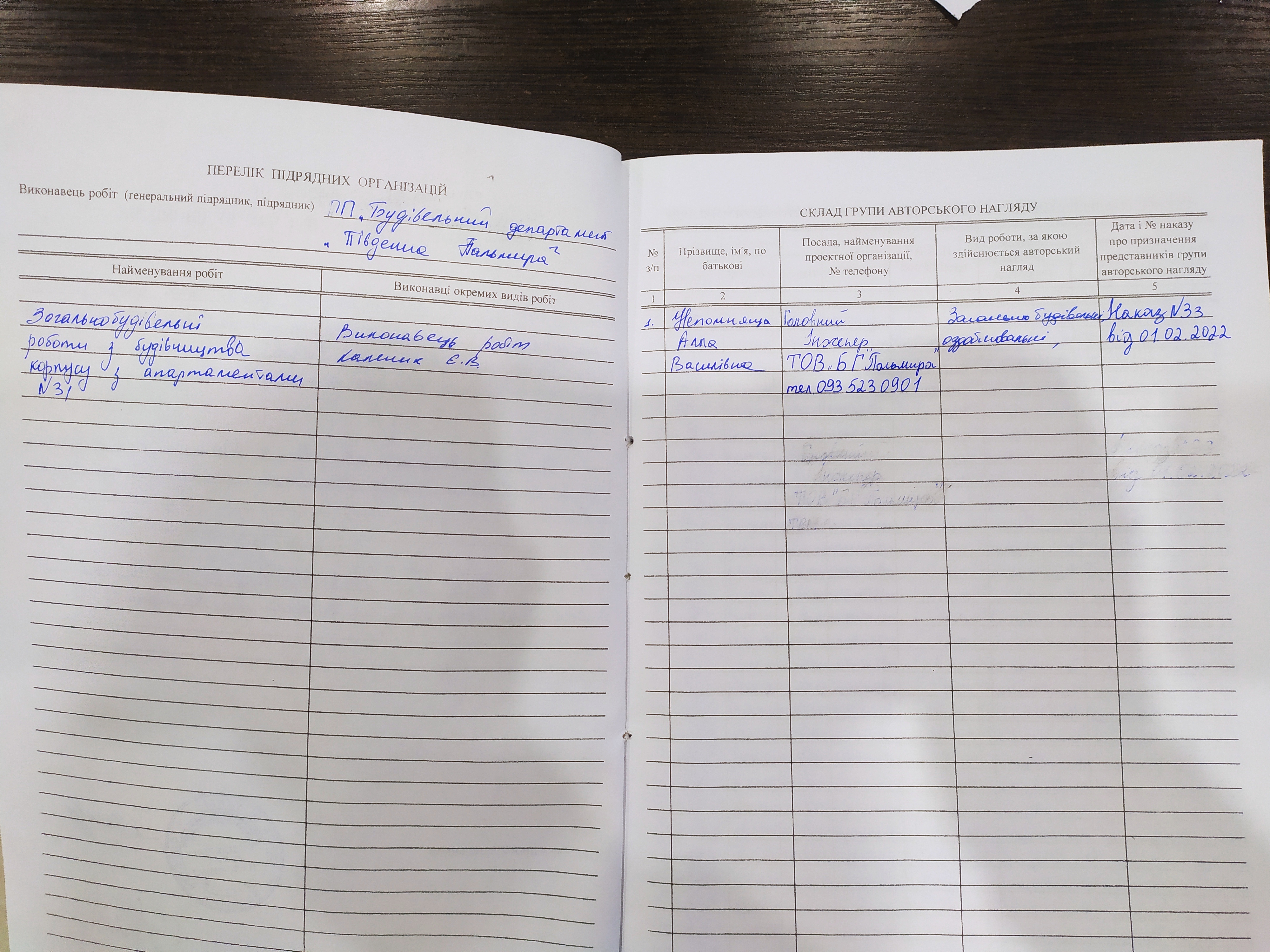 | Начальник дільниці | Каленик Євген Володимирович | загальнобудівельні роботи, оздоблювальні роботи, роботи по благоустрою території, пуско-налагоджувальні роботи інженерних мереж | Наказ ПП "Будівельний департамент "Південна Пальмира" | 253 о/с | 01.02.2022 |